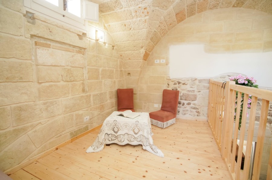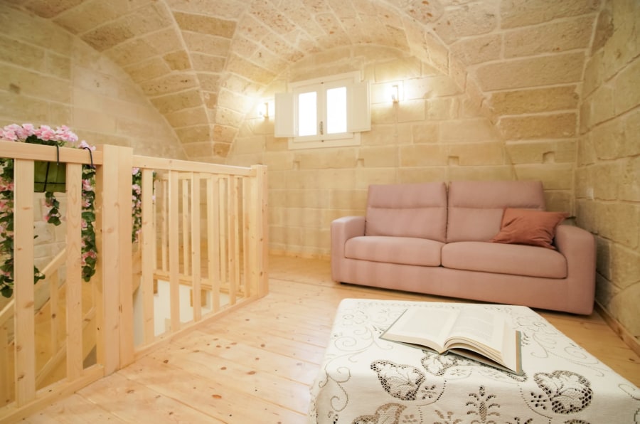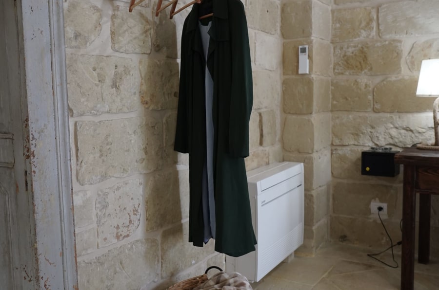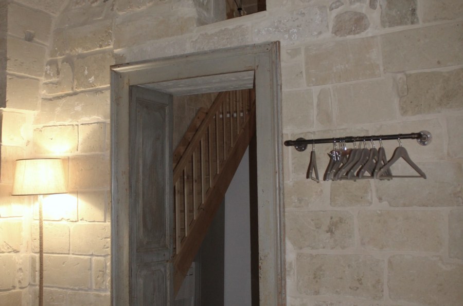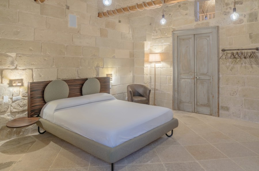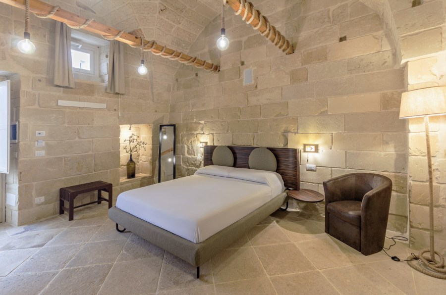 B&B in Zollino Dimora La Fuga presents the Corda Suite, a refined ground-floor accommodation designed for those seeking relaxation and comfort in the heart of Salento. Spacious and well-designed, the suite features a corner whirlpool tub for two with chromotherapy and a built-in radio, perfect for relaxing in the bubbles after a day of hiking or enjoying the sea.