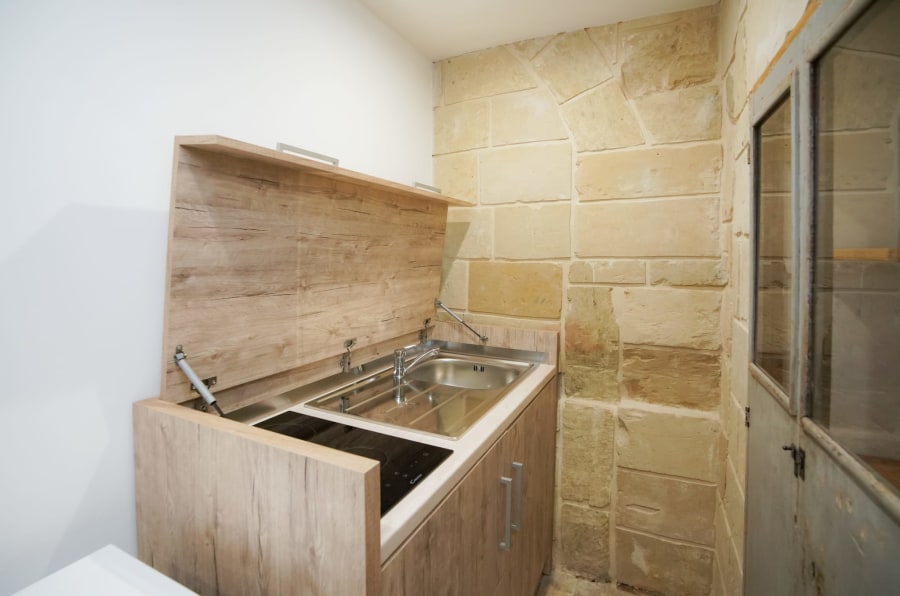 Equipped with a kitchen equipped with an induction hob and refrigerator, guests can prepare quick meals independently. A cozy mezzanine with a vintage sofa and armchairs creates an intimate and charming reading nook, enhanced by restored period furnishings.