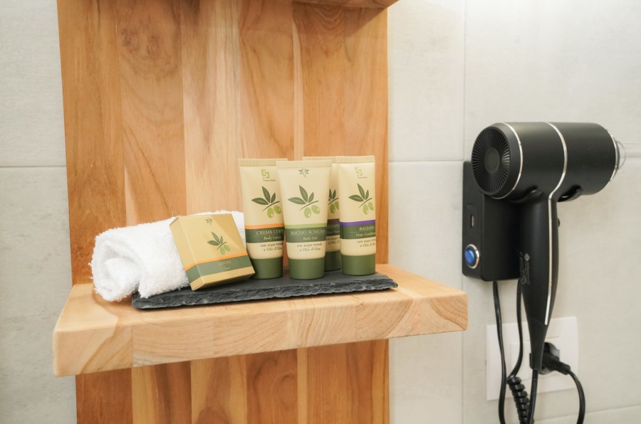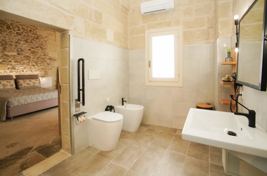 The suite features a fully accessible private bathroom, with a walk-in shower, horizontal grab bars, and aids to ensure maximum independence even for guests with reduced mobility.